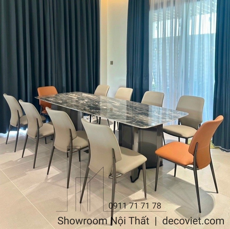 Được mệnh danh là vua của các loại đá, đá marble rất được ưa chuộng trong trang trí nội thất và bàn ăn đá marble là một trong những ứng dụng điển hình. Bàn ăn bằng đá marble là một trong những dòng sản phẩm bàn ăn cao cấp của nội thất DecoViet. Bộ Bàn Ăn 10 Ghế Mặt Đá Cao Cấp 1384S với 4 góc cắt bo oval tinh tế, mang lại cảm giác sang trọng cho không gian bếp của gia đình. Chân sắt thiết kế cách điệu vững chắc, khiến bộ bàn ăn mặt đá nhập khẩu này trở nên ấn tượng và thu hút hơn.