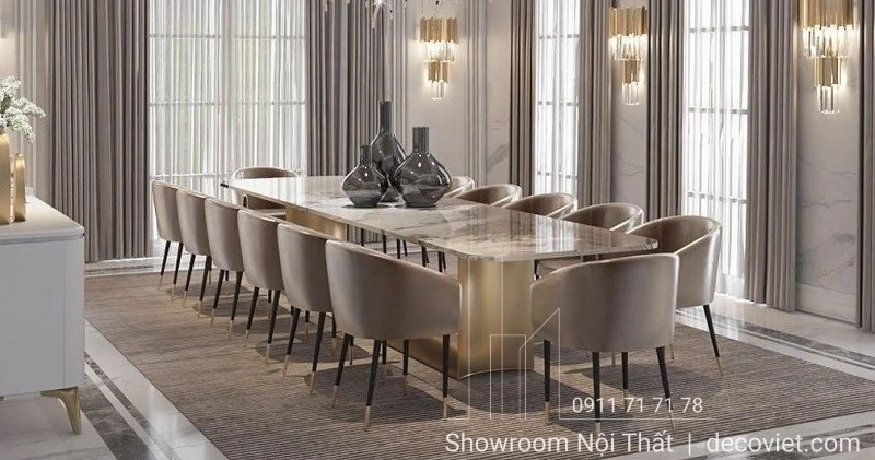 Bàn ăn 12 người là một trong những lựa chọn lý tưởng của giới thượng lưu. Bàn ăn mặt đá 12 ghế mang đến sự sang trọng, đẳng cấp trong từng đường nét. Bởi vì kích thước lớn nên bộ bàn ăn này chắc chắn sẽ là điểm nhấn nổi bật cho không gian dùng bữa, nâng tầm đẳng cấp cho tổng thể căn hộ.