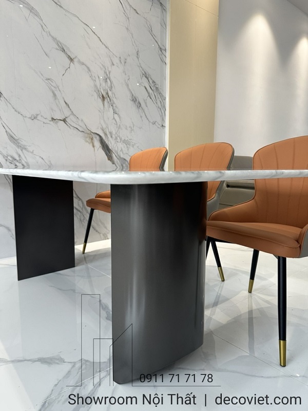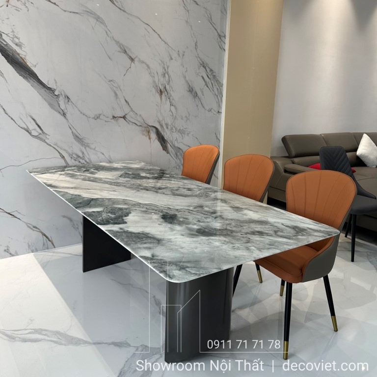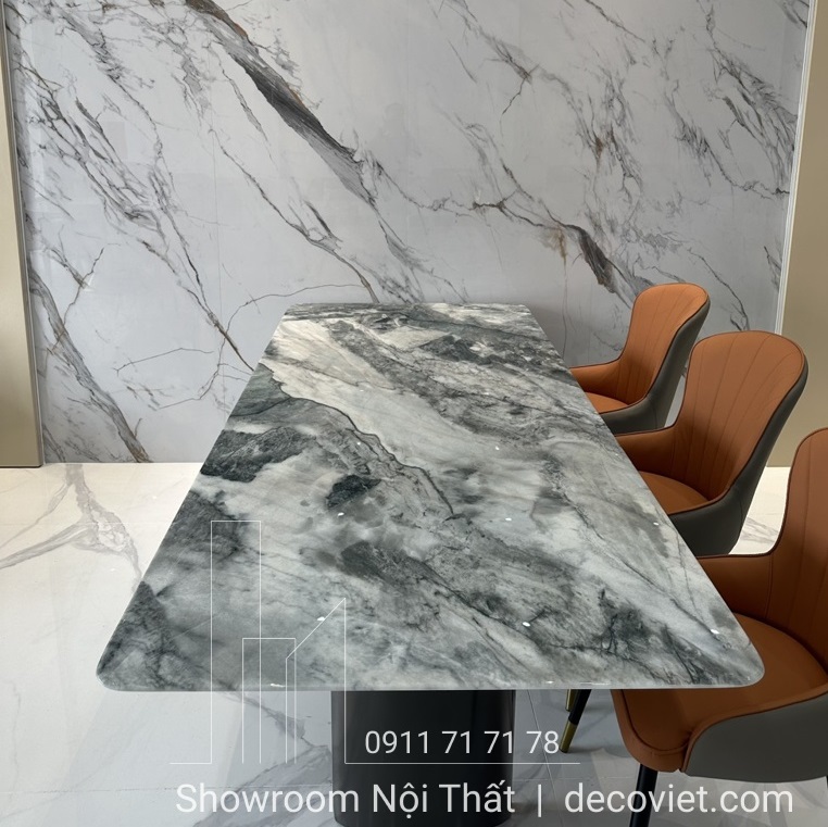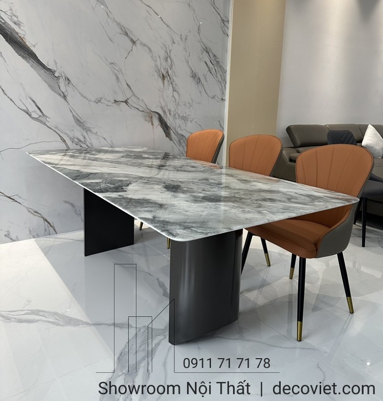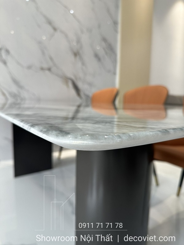 Bàn ăn mặt đá cẩm thạch tại DecoViet là mẫu thiết kế cuốn hút người nhìn bởi vẻ đẹp sang trọng, tinh tế và đẳng cấp. Bộ bàn ăn mặt đá nhập khẩu đẹp mang đến sự sang trọng, hiện đại trong từng đường nét, góp phần tạo dựng nên điểm nhấn đẳng cấp cho không gian căn bếp nhà bạn. Sự pha trộn giữa những mảng màu tối, sáng tạo nên những đường vân đá độc đáo. Ngoài ra mặt bàn ăn hình chữ nhật bo oval rất an toàn với người già và trẻ nhỏ, những vân đá độc đáo "có một không hai" mang đến vẻ đẹp khác biệt, cho không gian bếp gia đình ấn tượng và hoàn hảo hơn.