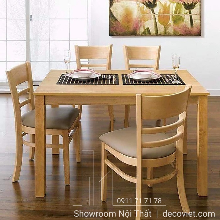 Bộ bàn ăn gỗ 4 ghế cũng cũng có nhiều kiểu dáng, mẫu mã và màu sắc đa dạng. Tuy nhiên những hạn chế của bàn ăn bằng gỗ công nghiệp là độ bền thấp, không chạm khắc họa tiết phức tạp. Bàn ăn gỗ sẽ thường phù hợp với những căn hộ theo phong cách đơn giản, mộc mạc và có thể được sử dụng ở quán cafe, quán ăn là phổ biến.
