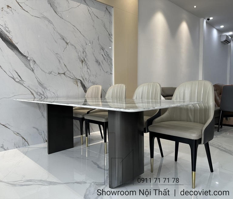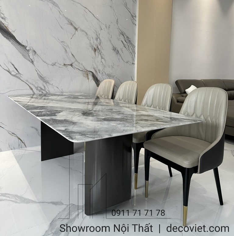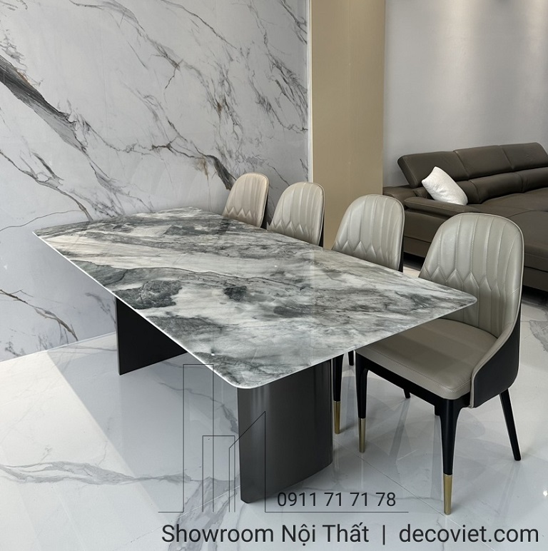 Bàn ăn mặt đá cẩm thạch tại DecoViet là mẫu thiết kế cuốn hút người nhìn bởi vẻ đẹp sang trọng, tinh tế và đẳng cấp. Bộ bàn ăn mặt đá nhập khẩu đẹp mang đến sự sang trọng, hiện đại trong từng đường nét, góp phần tạo dựng nên điểm nhấn đẳng cấp cho không gian căn bếp nhà bạn. Sự pha trộn giữa những mảng màu tối, sáng tạo nên những đường vân đá độc đáo. Ngoài ra mặt bàn ăn hình chữ nhật bo oval rất an toàn với người già và trẻ nhỏ, những vân đá độc đáo "có một không hai" mang đến vẻ đẹp khác biệt, cho không gian bếp gia đình ấn tượng và hoàn hảo hơn.