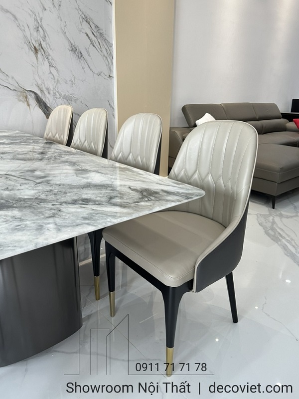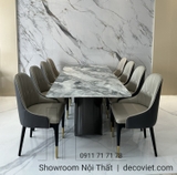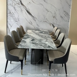Bộ bàn ăn 8 ghế mặt đá là một trong những mẫu bàn ăn đẹp với thiết kế sang trọng, đảm bảo về tính thẩm mỹ cũng như độ bền lâu dài của sản phẩm. Bộ bàn ăn 8 ghế nhập khẩu luôn đi đầu trong xu hướng trang trí nội thất bếp đẹp đẳng cấp, mang đến những bữa cơm ngon miệng cho gia đình bạn. Bàn Ăn Cao Cấp 2m2 1437S sở hữu các đường vân đá độc đáo, lạ mắt, đem lại sự mới lạ và thời thượng, là một trong những sản phẩm bàn ghế ăn được yêu thích nhất tại Nội thất DecoViet.