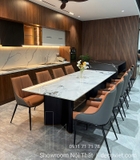 Bộ bàn ăn 8 ghế cao cấp sở hữu mặt đá trắng vân sang trọng kết hợp chân bàn gỗ trụ vững vàng, tạo nên tổng thể hiện đại, đẳng cấp. Ghế ăn bọc da hiện đại, form lưng ôm nhẹ giúp tư thế ngồi thoải mái, phù hợp với không gian căn hộ, nhà phố và biệt thự phong cách sang trọng.