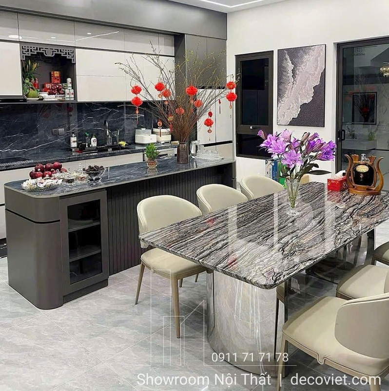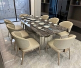 Ấn tượng ngay từ ánh nhìn đầu tiên, bộ bàn ăn 8 ghế đẹp thu hút với mặt đá cẩm thạch tự nhiên thanh thoát, nổi bật nhưng không quá phô trương. Sự kết hợp giữa đá tự nhiên được xử lý tỉ mỉ và chân bàn bằng inox sáng bóng như gương tạo nên một tổng thể vừa hiện đại, vừa mang tính nghệ thuật, nâng tầm không gian sống của bạn một cách tinh tế.