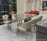 Bộ bàn ghế ăn gia đình không cần quá phô trương, chỉ cần lựa chọn đúng là đủ khiến không gian trở nên ấm cúng và tinh tế. Bàn Ăn Chân Inox Cao Cấp 8 Ghế 2672S là một thiết kế nổi bật tại DecoViet – nhẹ nhàng, hiện đại nhưng vẫn đủ sức hút. Mặt đá cẩm thạch tự nhiên bền bỉ cùng chân bàn inox sáng bóng như gương. Nhìn thì đơn giản, nhưng lại tạo cảm giác rất “gu”, rất riêng. Một bộ bàn ghế ăn vừa đủ để cả nhà sum họp, để giữ lại những khoảnh khắc gần gũi bên nhau mỗi ngày.