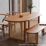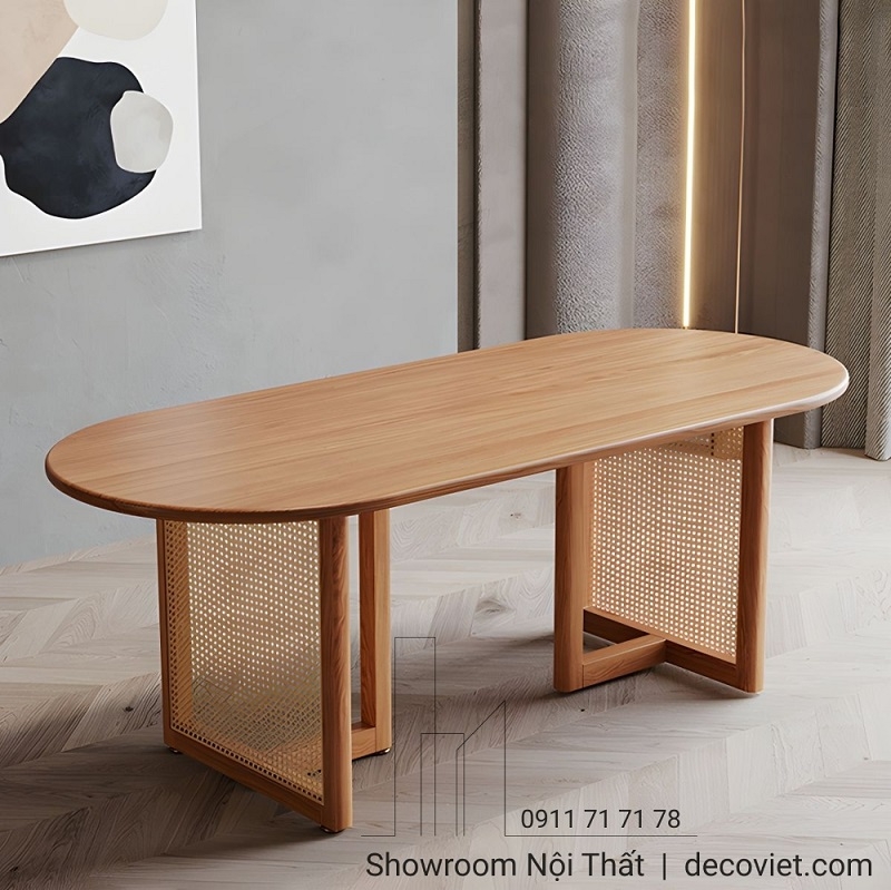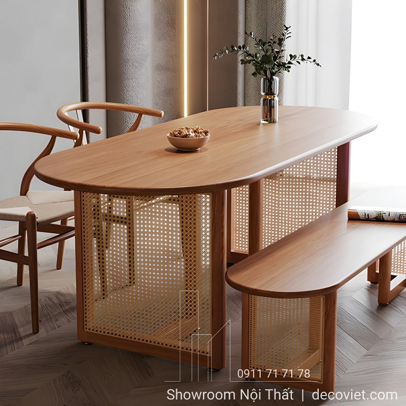 Bàn Ăn Gỗ Đẹp Hiện Đại 2673S gây ấn tượng với mặt bàn dáng oval bo tròn mềm mại, vừa thân thiện vừa an toàn khi sử dụng trong gia đình có trẻ nhỏ. Phần chân bàn với chi tiết đan mây khéo léo không chỉ tạo điểm nhấn độc đáo mà còn giúp tổng thể nhẹ nhàng, thanh thoát hơn. Đây là mẫu thiết kế dễ ứng dụng trong các không gian nội thất mang phong cách Japandi, Scandinavian hoặc hiện đại tối giản.