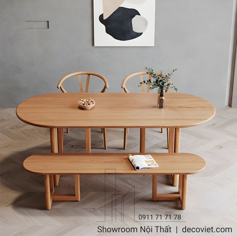 Không phải lúc nào bộ bàn ghế ăn sang trọng có những chi tiết cầu kỳ. Đôi khi, chính sự tối giản, tự nhiên và tinh tế lại tạo nên vẻ đẹp vượt thời gian. Bộ Bàn Ăn Gỗ Đẹp Hiện Đại 2673S là lựa chọn lý tưởng cho những ai yêu thích nội thất mang tinh thần mộc mạc nhưng vẫn chỉn chu và có gu. Với thiết kế oval mềm mại, chất liệu gỗ tự nhiên ấm áp và cách phối ghế linh hoạt giữa ghế tựa và ghế băng dài, mẫu bàn ăn đẹp này mang đến cảm giác gần gũi, thoải mái mà vẫn nổi bật trong không gian sống.