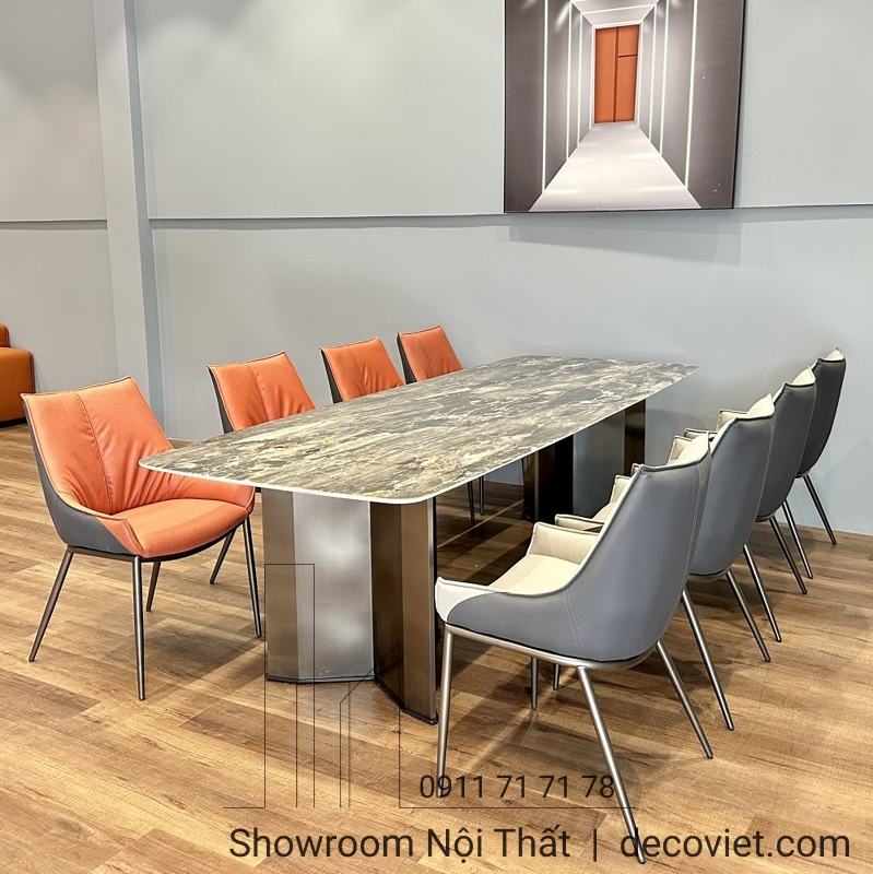 Được mệnh danh là vua của các loại đá, đá marble rất được ưa chuộng trong trang trí nội thất và bàn ăn đá marble là một trong những ứng dụng điển hình. Bàn ăn bằng đá marble là một trong những dòng sản phẩm bàn ăn cao cấp của nội thất DecoViet. Bộ Bàn Ăn Mặt Đá Marble Nhập Khẩu 8 Ghế 1320S với 4 góc cắt bo oval tinh tế, mang lại cảm giác sang trọng cho không gian bếp của gia đình. Chân sắt thiết kế cách điệu vững chắc, khiến bộ bàn ăn 8 ghế mặt đá này trở nên ấn tượng và hút mắt hơn.