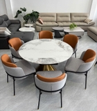 Mẫu bàn ăn tròn xoay mặt đá nổi bật với mặt bàn tròn mặt đá Ceramic trắng vân sang trọng, kiểu dáng tròn đầy là biểu tượng cho mọi bữa cơm sum vầy ấm cúng. Phần chân bàn trụ hình nón mạ vàng tạo điểm nhấn mạnh mẽ, nâng đỡ mặt bàn vững chắc, an toàn khi sử dụng.