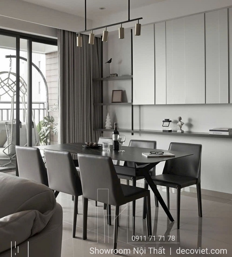 ➤ Mang gam màu tối giản nhưng tạo ra sự cuốn hút đặc biệt cho không gian nhờ kiểu dáng thiết kế và vân đá bàn ăn sang trọng.