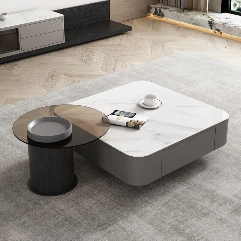 - Mẫu bàn sofa mặt đá hiện đại có thiết kế gồm 1 bàn lớn và 1 bàn nhỏ khác nhau về chiều cao và kích thước. Bàn trà lớn có chiều cao thấp hơn bàn trà nhỏ, được trang bị hộc kéo rộng rãi và tiện nghi.