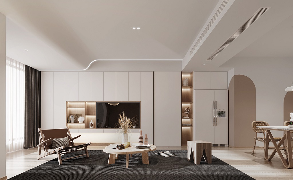 Thiết kế loại bỏ kệ tivi thay vào đó là tivi treo tường cho căn phòng rộng rãi hơn