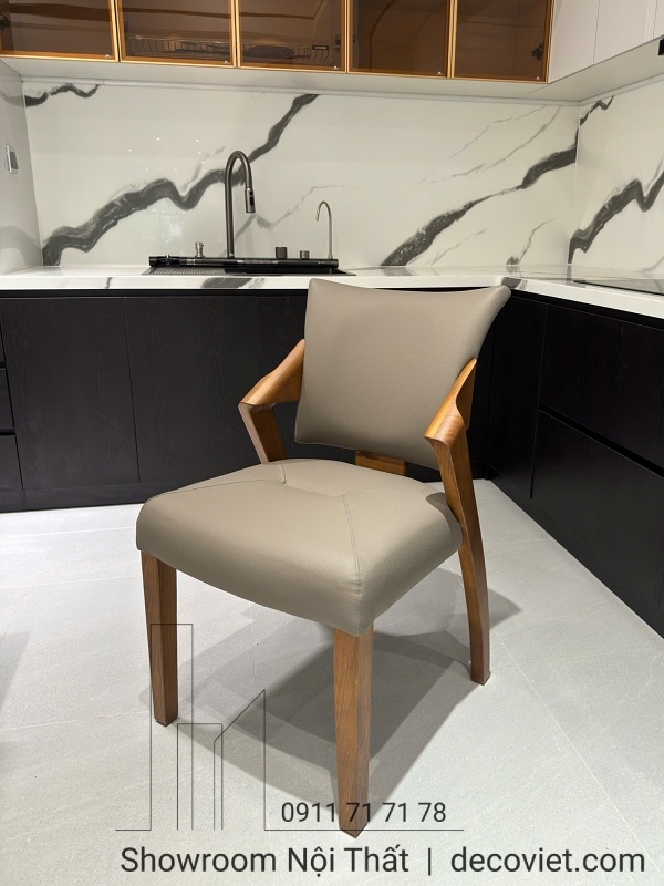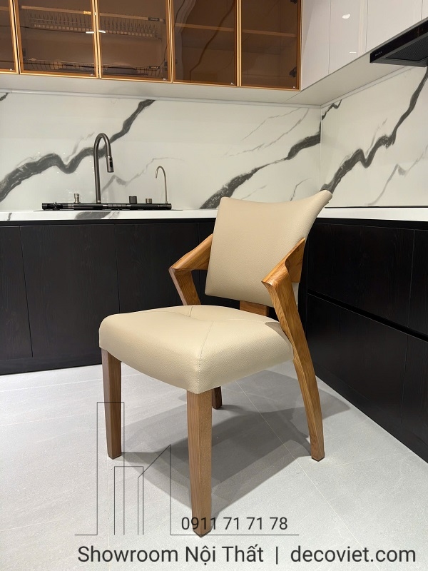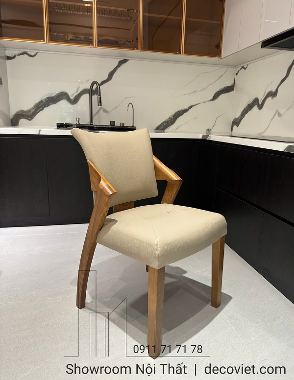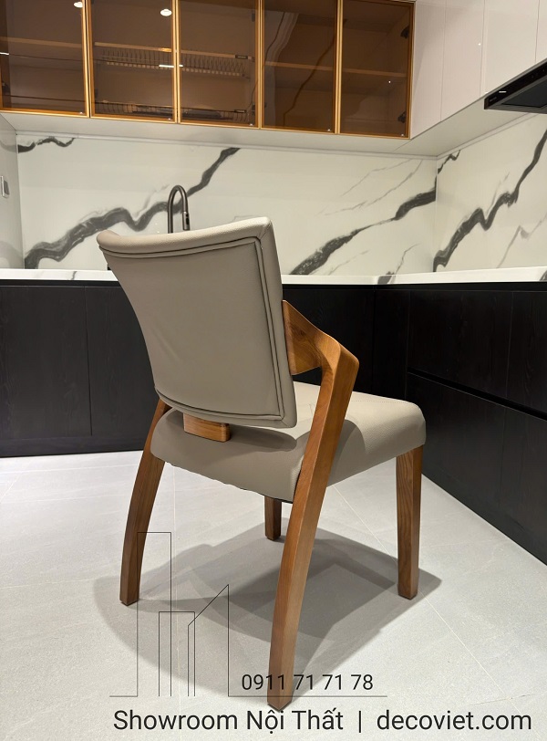 Ghế ăn gỗ bọc da cao cấp đi cùng với bộ bàn ăn mặt đá mang nét đẹp thời thượng, giúp nâng tầm vẻ đẹp đẳng cấp cho không gian ăn uống. Phần mặt ngồi và lưng được phủ bằng một lớp da cùng nệm mút đầy đặn, mang lại cảm giác mềm mại, thư giãn khi sử dụng.