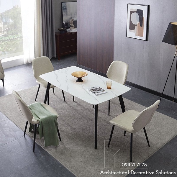 Bộ bàn ăn chân sắt mặt đá PC trắng vân hiện đại.