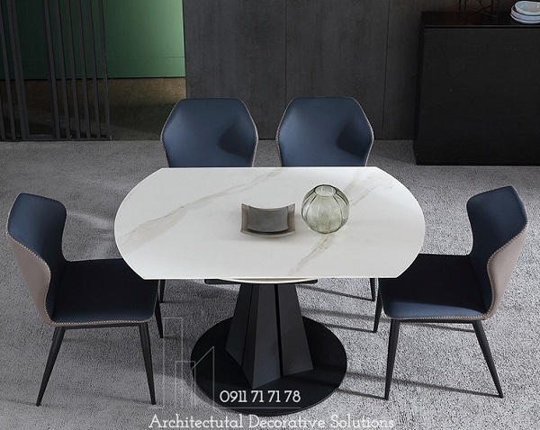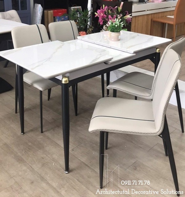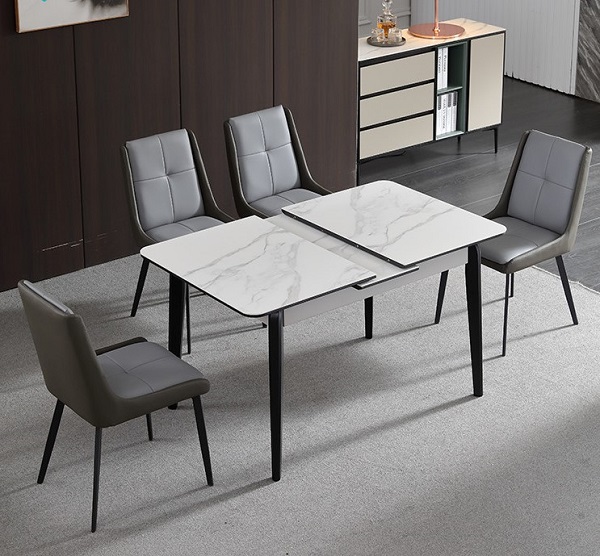 Bộ bàn ăn kéo dài thông minh cao cấp chân sắt mặt đá ceramic trắng.