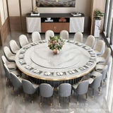 Bộ bàn tròn mâm xoay 20 ghế được thiết kế theo phong cách hiện đại kết hợp sang trọng, phù hợp cho phòng ăn biệt thự, nhà hàng cao cấp hoặc phòng họp sang trọng. Mặt bàn đá trắng vân cao cấp, kết hợp mâm xoay tiện lợi, giúp các bữa ăn thêm thuận tiện và đầm ấm.
