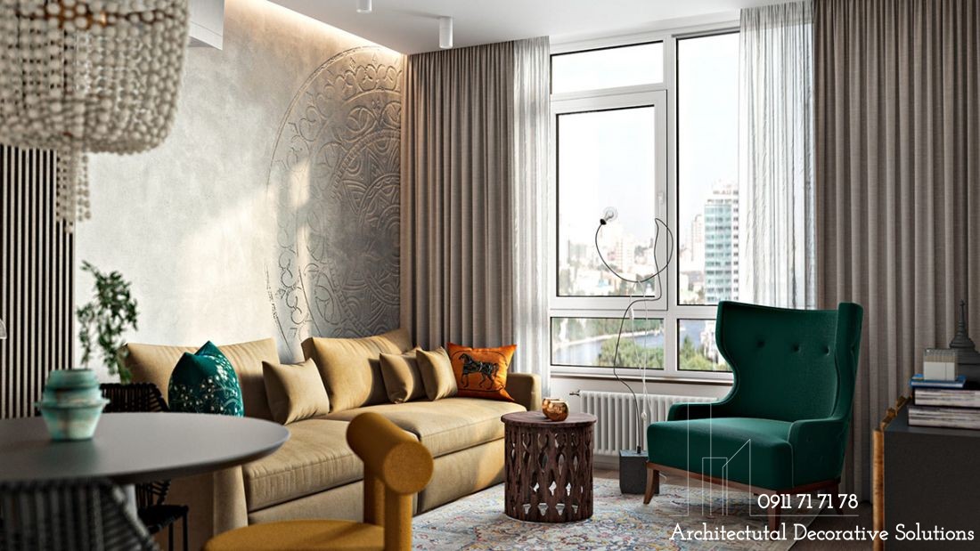 Một chiếc ghế tựa màu xanh lục hay những chiếc gối ôm sáng màu sẽ là điểm nhấn thu hút trong không gian phòng khách, bên cạnh đó là sự bố trí "cố ý" với chiếc bàn phong cách cổ điển nằm giữa căn phòng.
