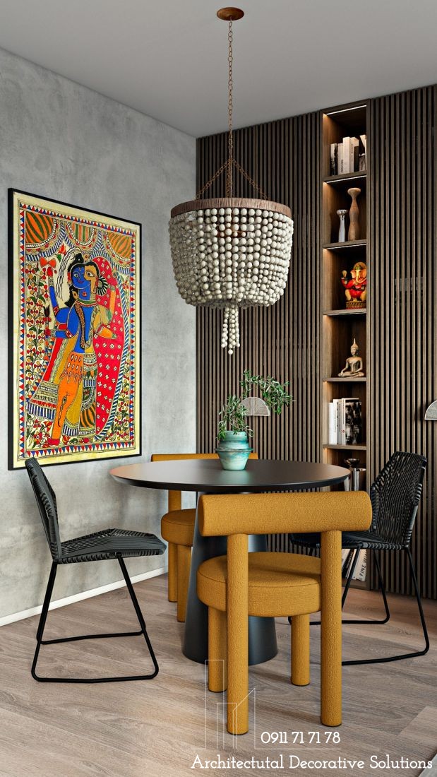Trong khu vực ăn uống, bàn ăn nhỏ được bao quanh với hai kiểu ghế hai màu khác nhau tăng sự thoải mái, thư giãn cho chủ nhân. Một chiếc đèn chùm đính hạt khá cầu kỳ, đặc biệt không quên bổ sung tác phẩm nghệ thuật đầy màu sắc truyền thống của Ấn Độ. Từ bàn ăn tới khung ảnh trên tường hay đèn chùm phía trên có tông màu tương đồng, mang lại ấn tượng tinh tế. Hai chiếc ghế ăn trong bức hình dường như không có sự liên quan nào với nhau nhưng nếu quan sát kĩ bạn có thể nhận ra chúng gần giống nhau về tỷ lệ và hình dáng.