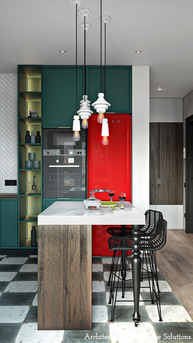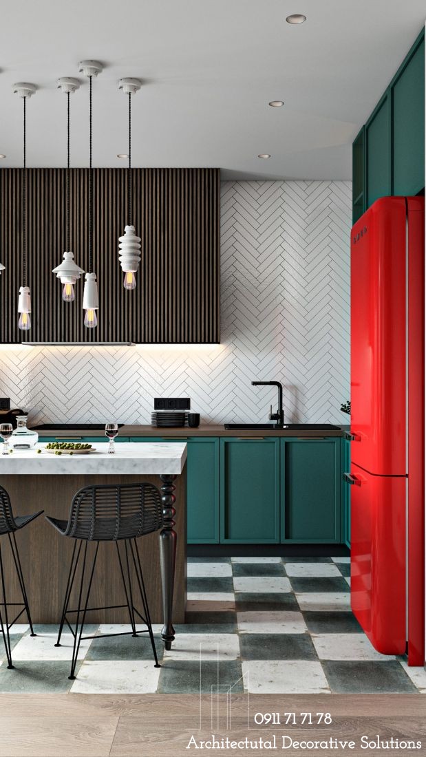 Tạo sự tương phản màu sắc đầy táo bạo trong không gian bếp giữa tủ bếp màu xanh lá cây đậm và màu đỏ tươi từ chiếc tủ lạnh. Màu sắc trong phong cách chiết trung rất thoải mái, bạn không hề bị bó buộc trong vấn đề lựa chọn, bởi hầu như không có một nguyên tắc nào quy định trong vấn đề này. Việc sử dụng màu sắc sẽ phụ thuộc hoàn toàn bởi sở thích cá nhân, có thể pha trộn các tông màu theo công thức của riêng mình, hay kết hợp các tone màu trong cùng một phối cảnh, miễn sao bạn thấy hài lòng và chỉ cần tránh mất gây thiện cảm.