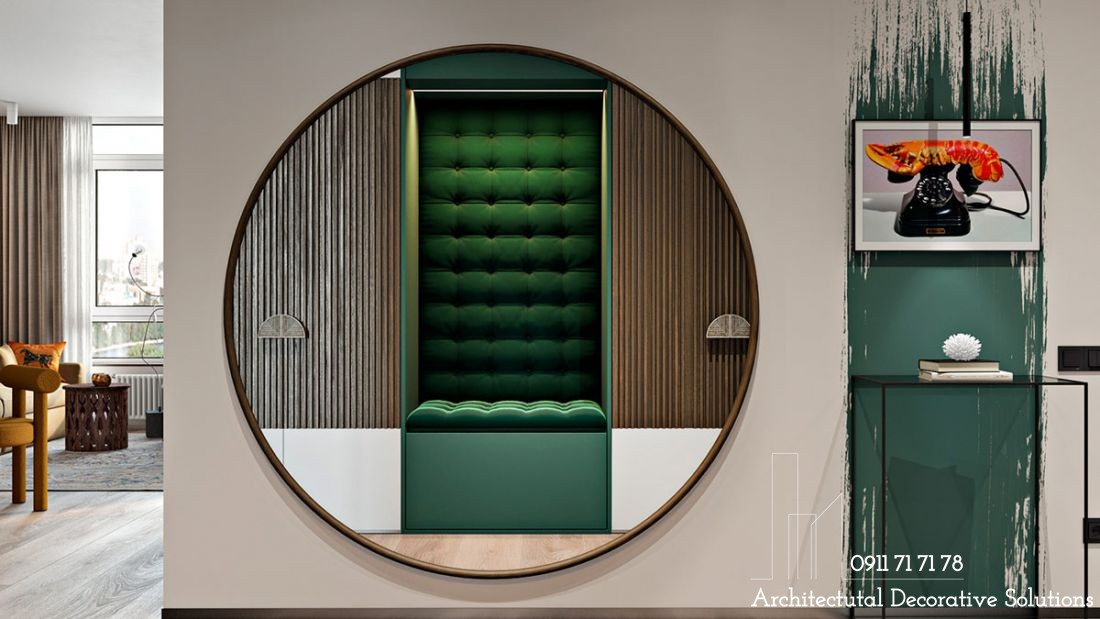 Chiếc gương tròn khổng lồ phản chiếu ghế bọc đệm xanh tạo ra một điểm nhìn thú vị ngay tại hành lang.