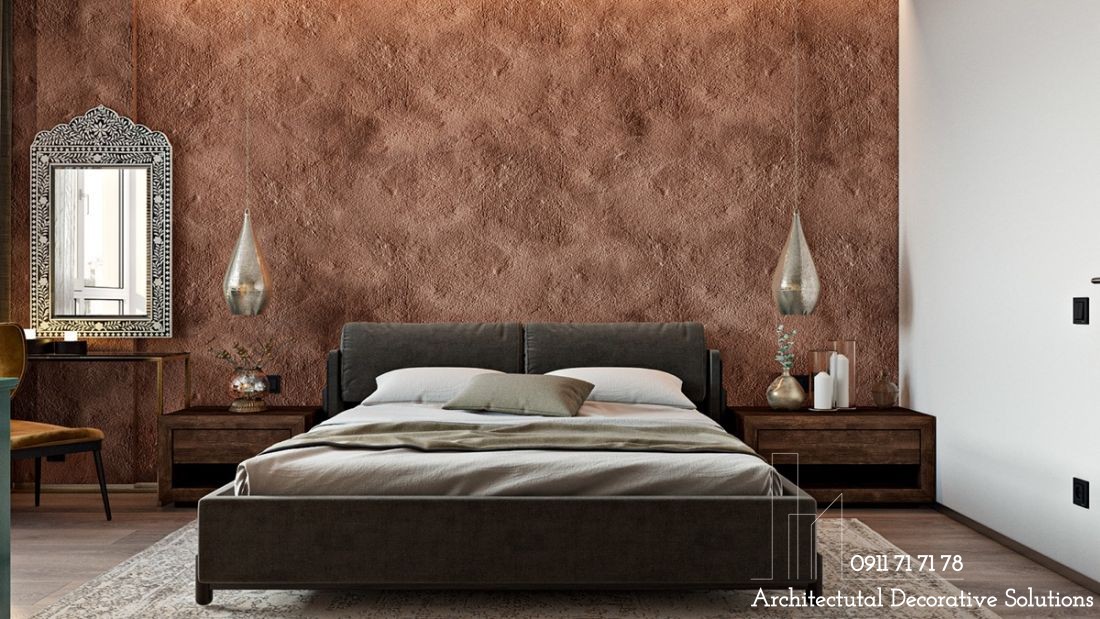 Một bức tường đất sét lớn sẽ là điểm nhấn ấn tượng cho phòng ngủ mộc mạc này, đồng thời tăng sự rung cảm với những phụ kiện chi tiết cổ điển: tấm thảm, gương hay đèn trang trí...
