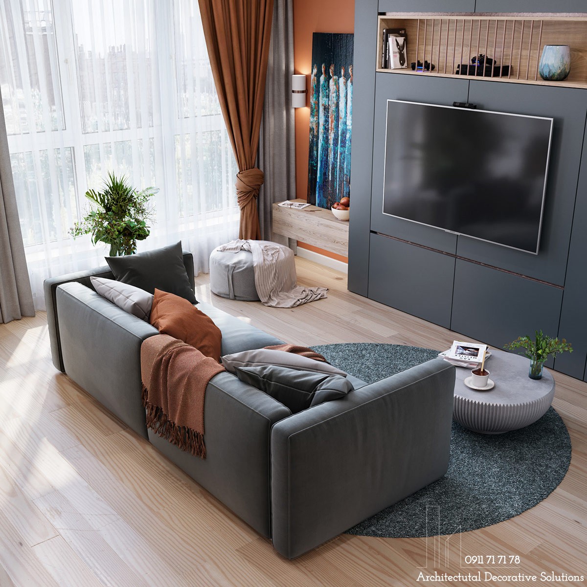 Phòng khách nhỏ với ghế sofa màu xám, một tấm thảm tròn lớn phân cách không gian với khu vực nhà bếp. Phòng khách được thêm chiều sâu bằng cách thiết lập tường gắn tivi, bên cạnh là hốc lưu trữ màu cam nổi bật.