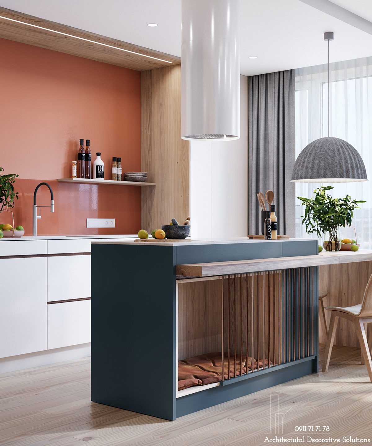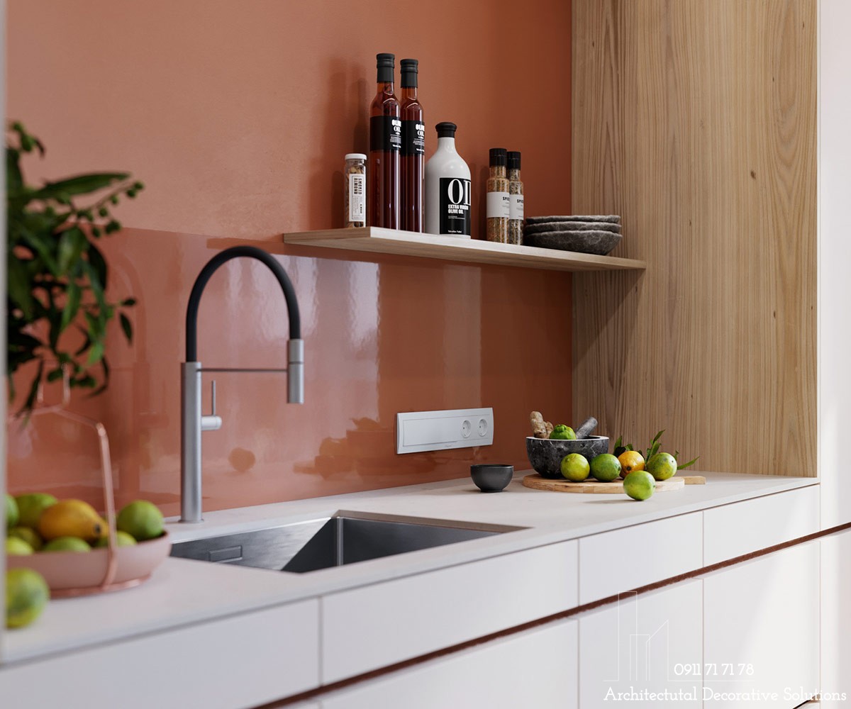 Khu vực nhà bếp với bức tường màu cam tạo chiều sâu cho không gian.