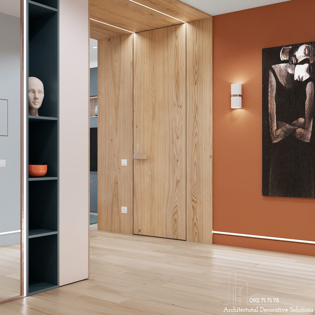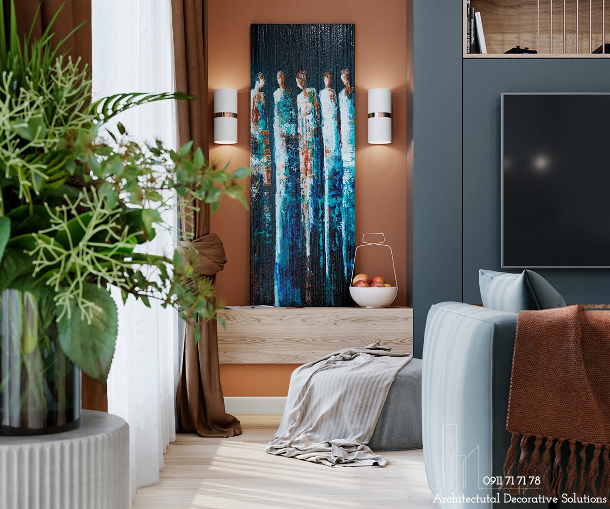 Tác phẩm nghệ thuật màu xanh tạo điểm nhấn ở hốc màu cam, được thiết kế thêm đèn chiếu sáng tạo nét nghệ thuật.