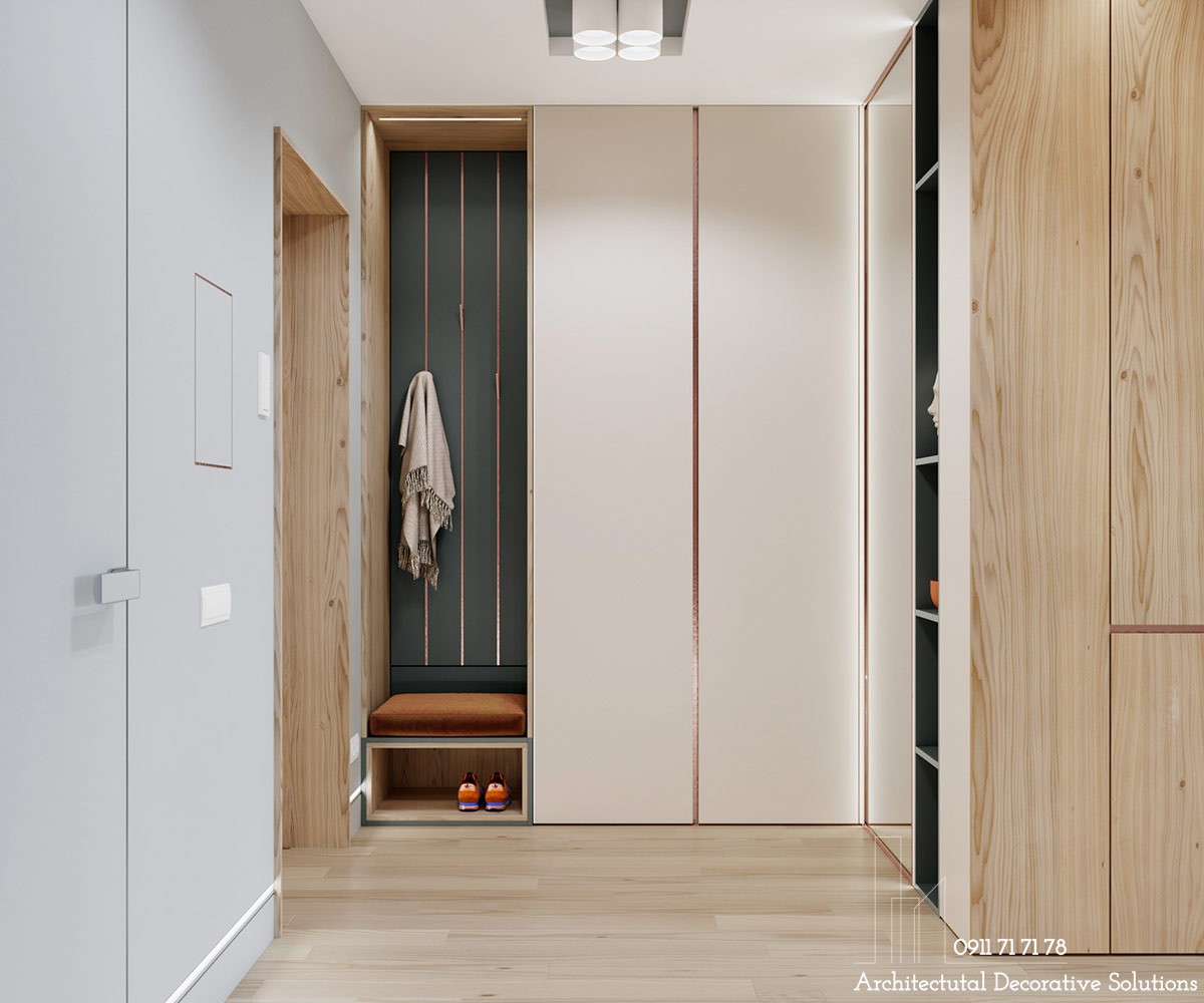 Điểm nhấn màu cam sắc nét xác định một chiếc giày và áo khoác ở cửa.