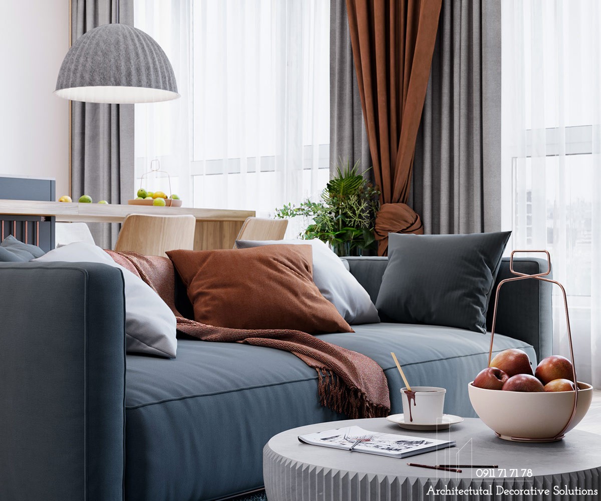 Gối ôm trên ghế sofa, rèm che cửa màu cam cháy nổi bật với sắc xám trong phòng khách.