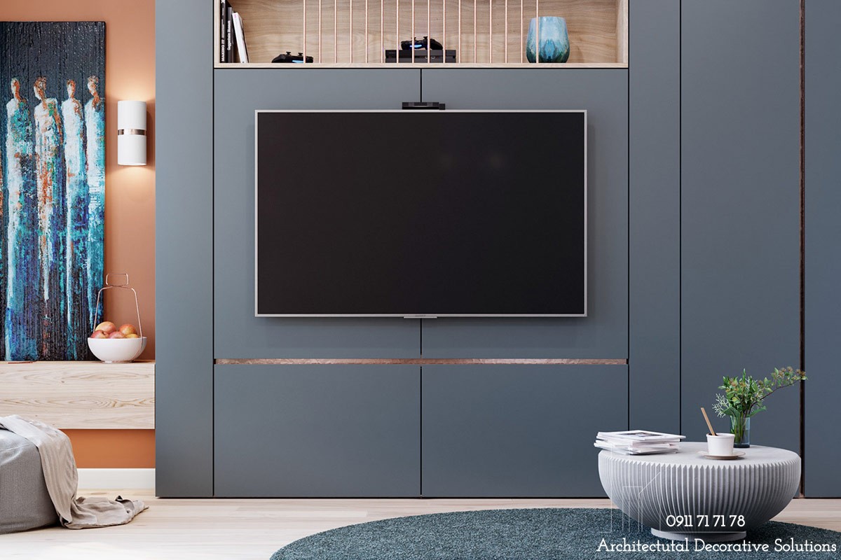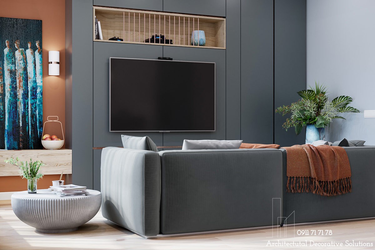 Không giống với các thiết kế thường thấy, thiết kế căn hộ 78m2 này loại bỏ chiếc kệ tivi rườm rà giúp tăng thêm không gian cho phòng khách.