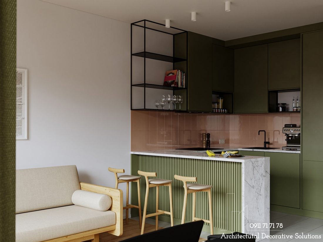 Gỗ sáng cùng màu xanh lá cây tạo nên một khu vực bếp đầy mới mẻ, trẻ trung. Nguyên tắc bố trí nội thất phòng khách cơ bản tạo nên một phòng khách đẹp và phù hợp với cuộc sống sinh hoạt của gia đình.