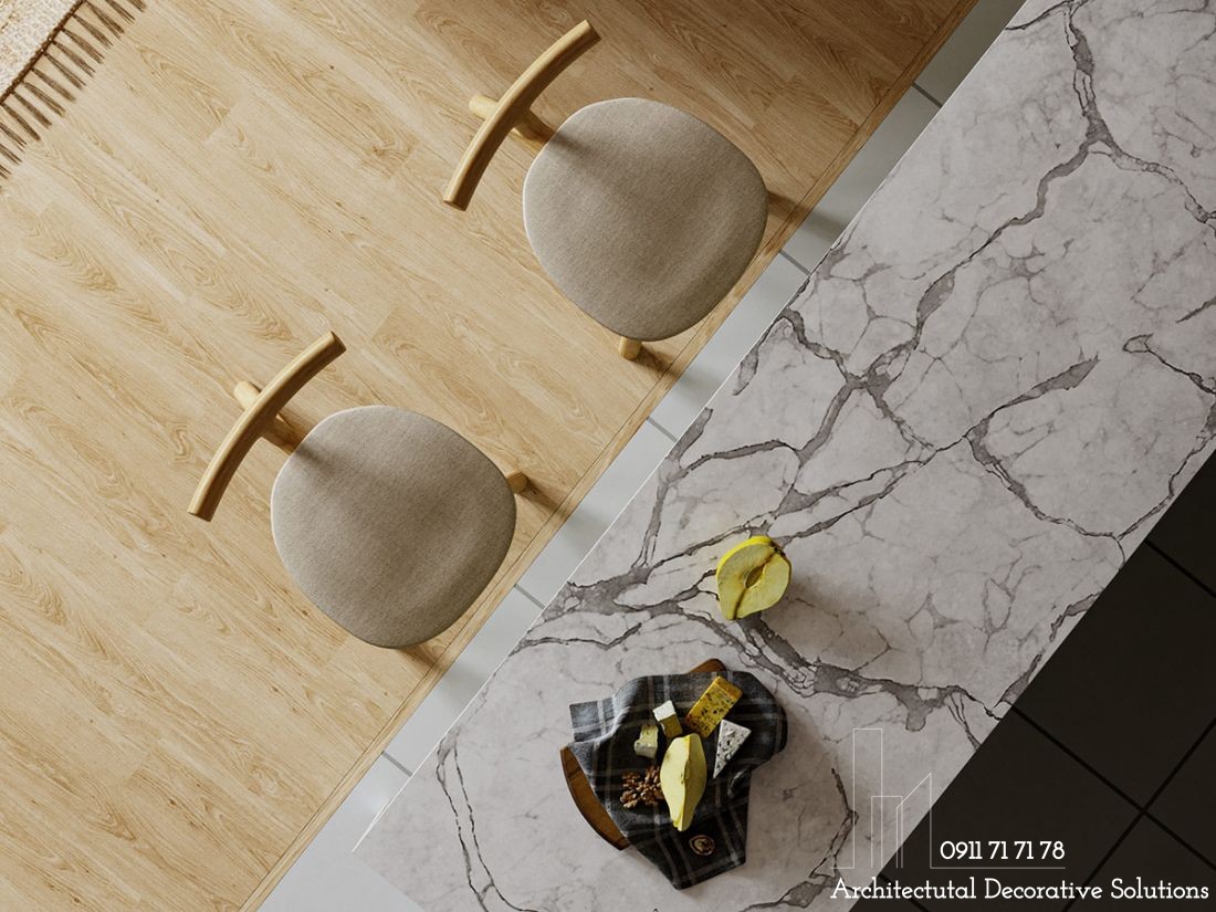 Mặt bàn ăn làm bằng đá cẩm thạch góp phần nên một không gian hiện đại, tinh tế. Yếu tố tạo nên vẻ đẹp bất ngờ cho căn hộ nhỏ chính là lựa chọn các chất liệu, vật liệu thân thiện với môi trường.