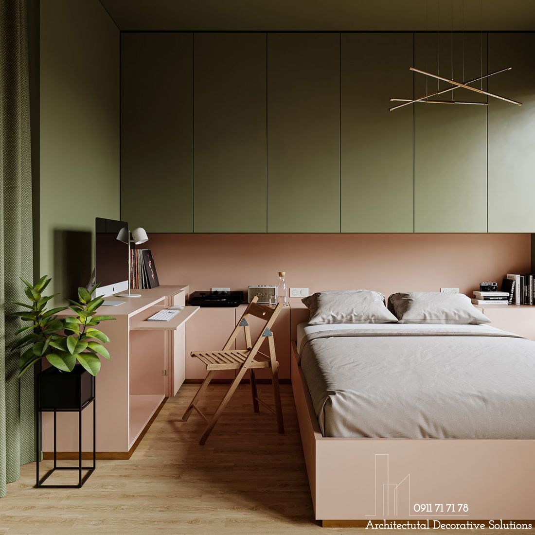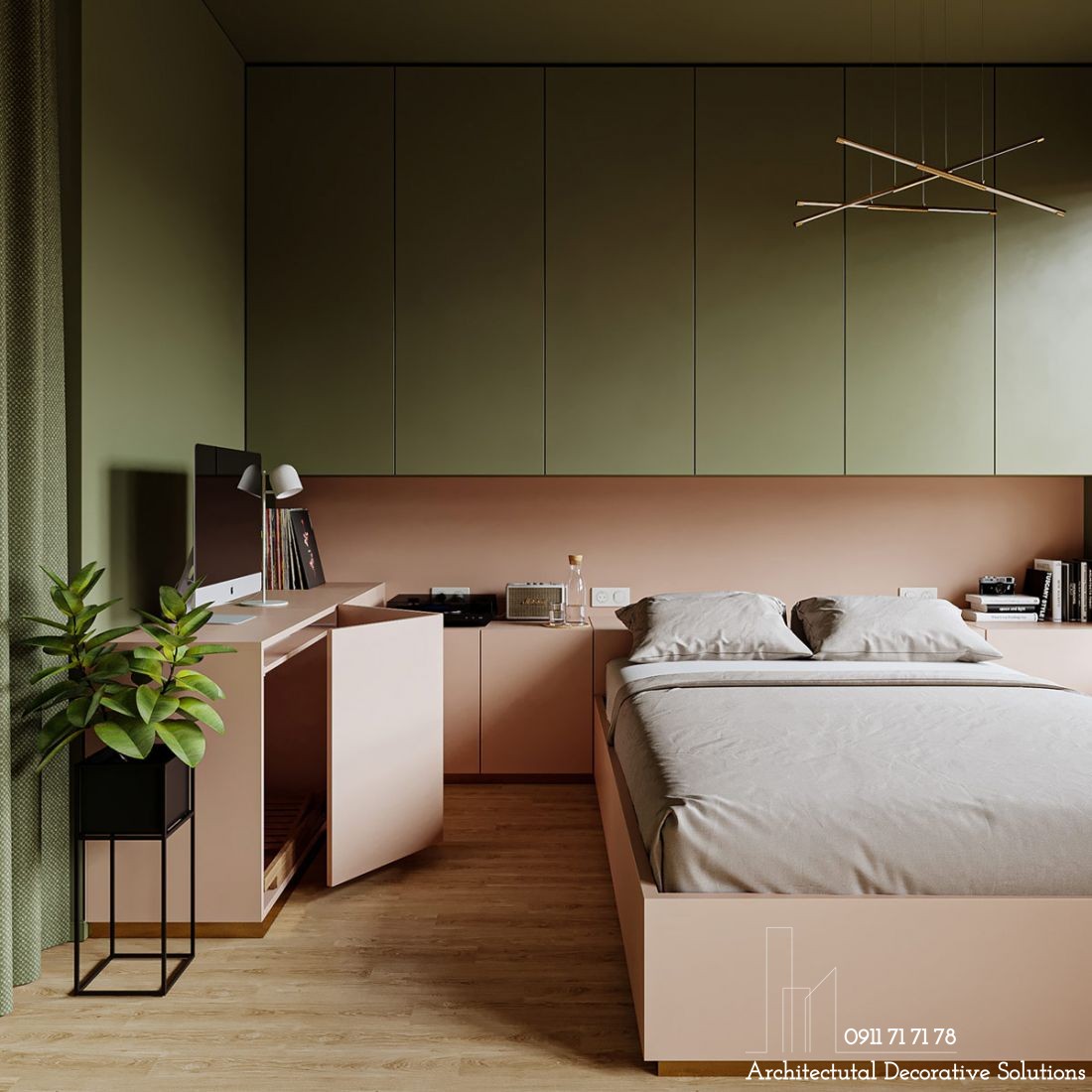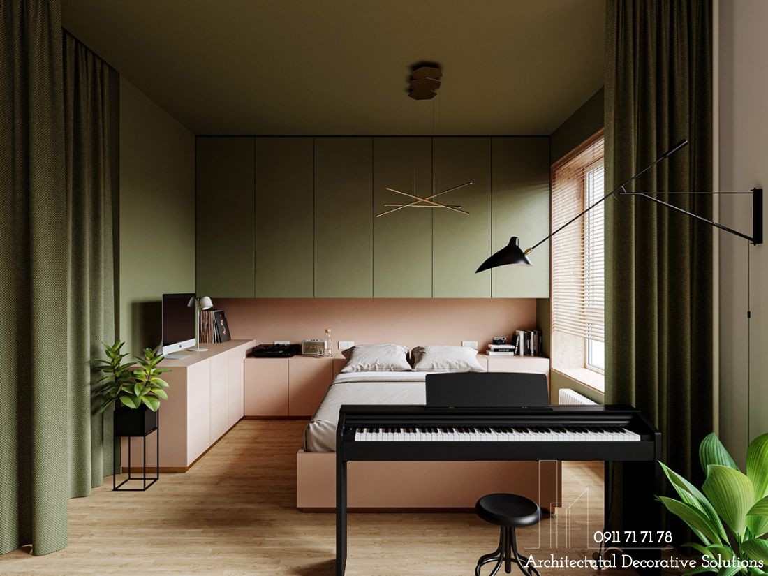 Cách bài trí nội thất thuận tiện cho mục đích sử dụng. Tủ lưu trữ được tận dụng thành bàn làm việc ngay cạnh giường.