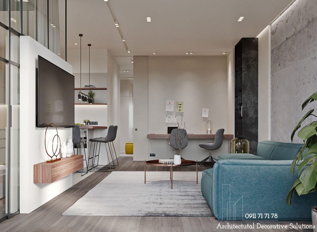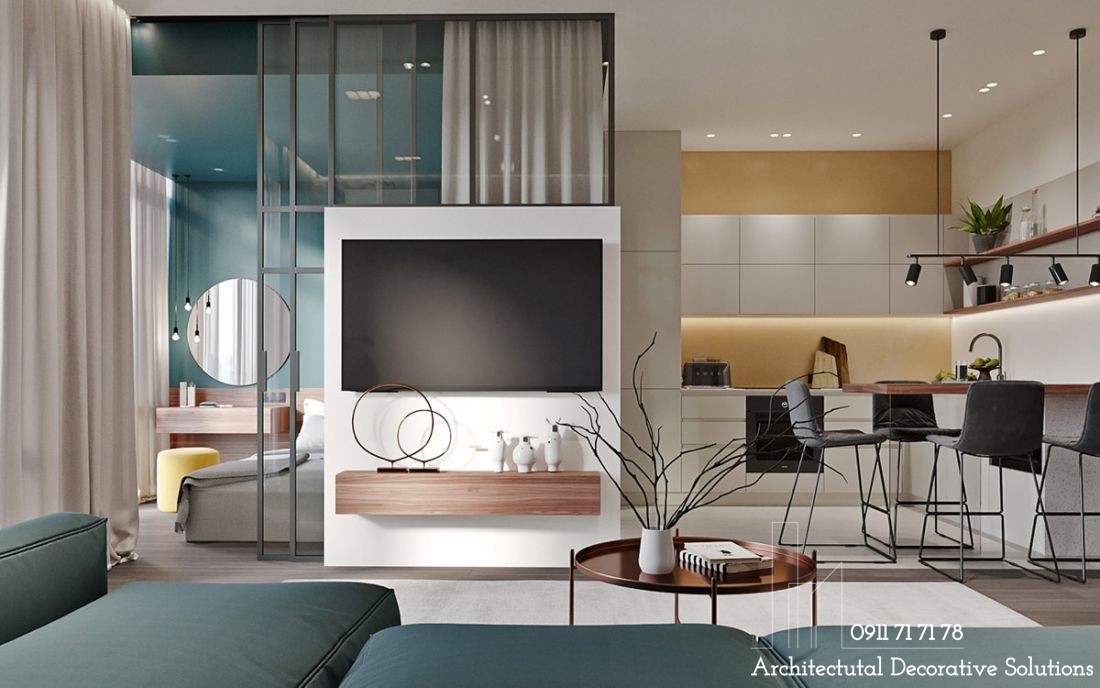 Vách ngăn được thiết kế ở vị trí trung tâm của bức tường, có kích thước nhỏ chỉ che khuất một phần của vách kính phòng ngủ nhằm tạo điều kiện cho ánh sáng tràn ngập vào không gian bên trong. Một chiếc kệ tivi treo chất liệu gỗ đơn giản nhưng là một điểm nhấn hoàn hảo cho phòng khách