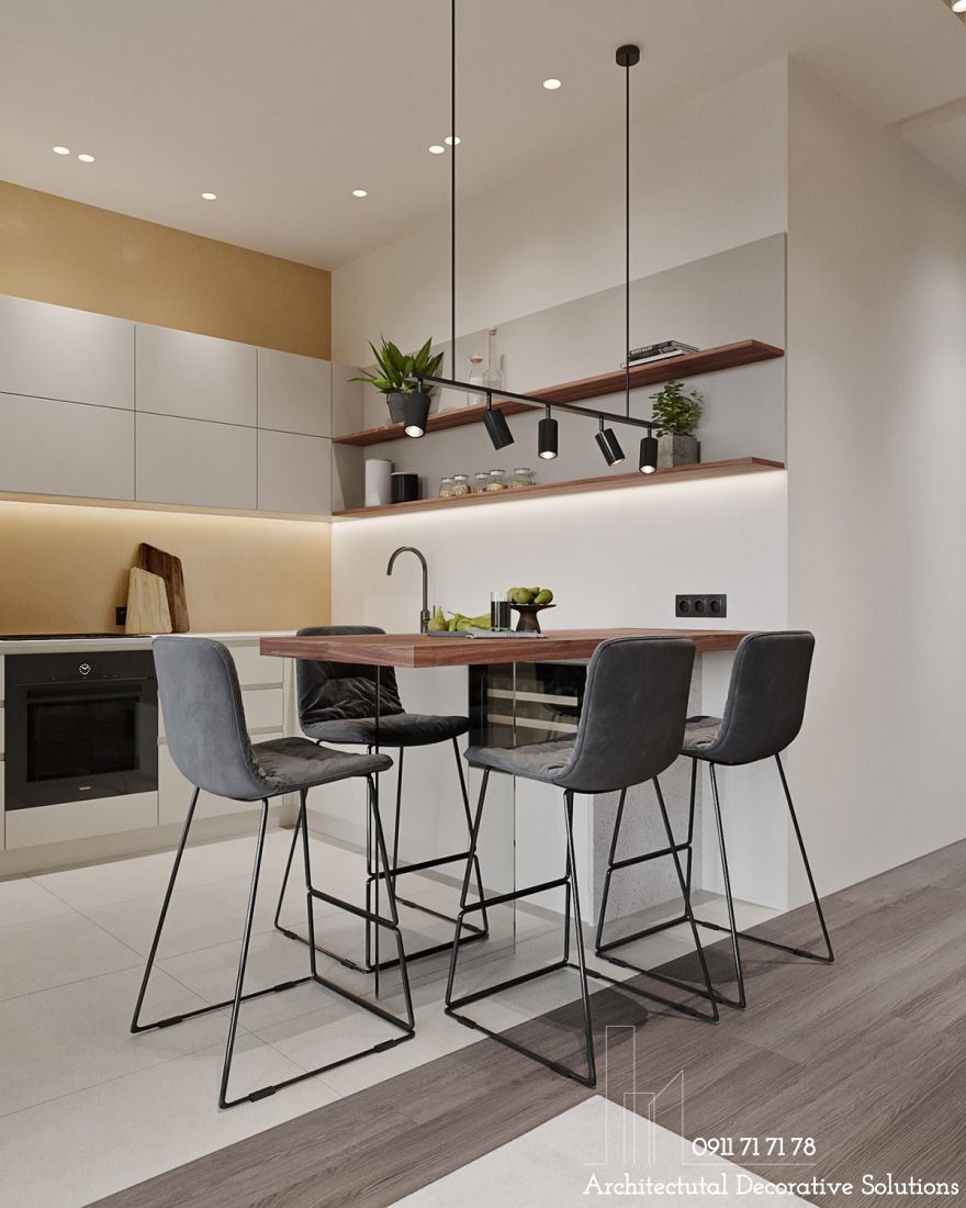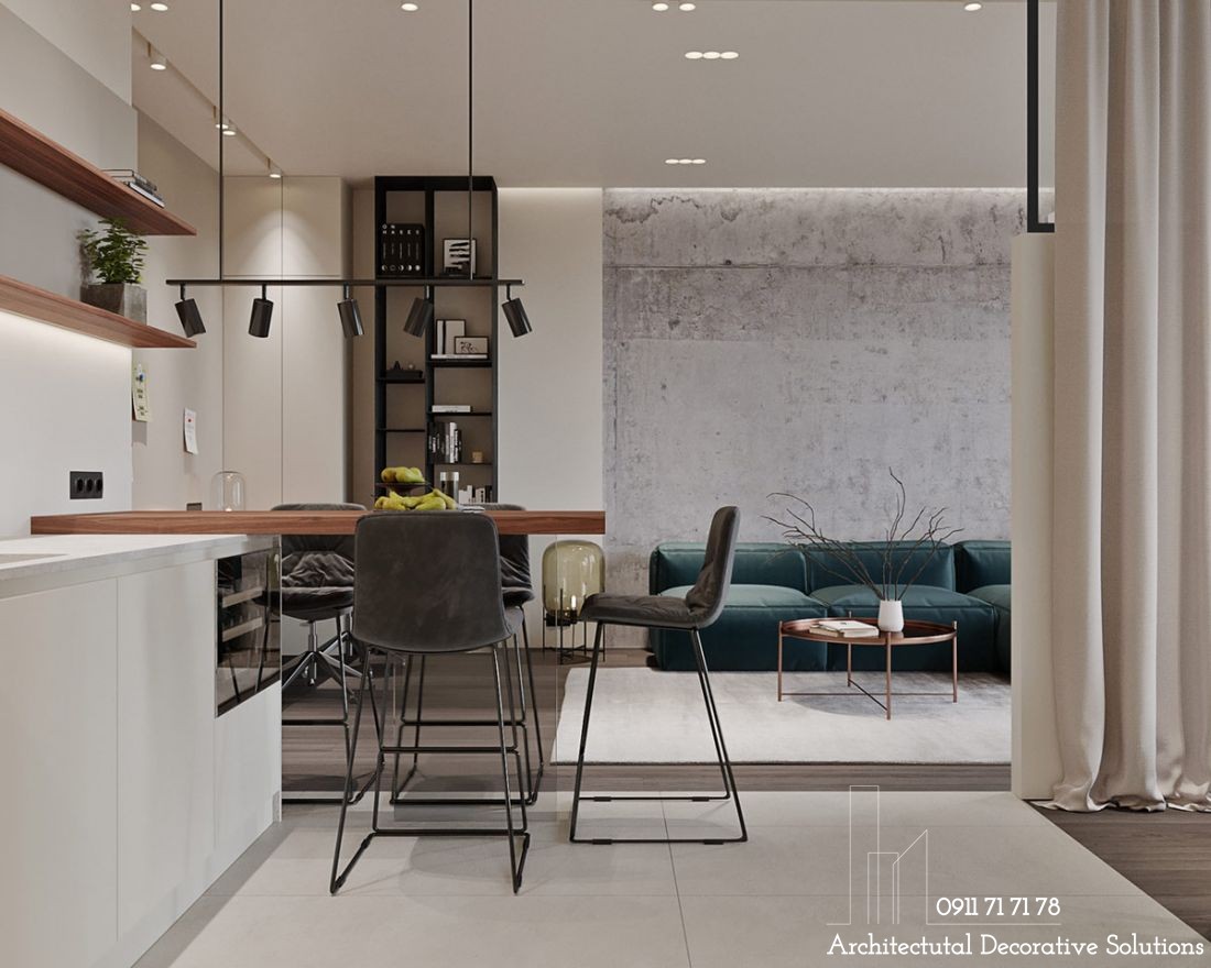 Tiếp theo cách bố trí phòng khách hình chữ L, xung quanh vách kính phòng ngủ đưa chúng ta đến với phòng bếp và ăn. Không gian phòng bếp được liên thông với phòng khách. Kiểu không gian mở này sẽ giúp căn hộ thông thoáng, rộng rãi hơn.