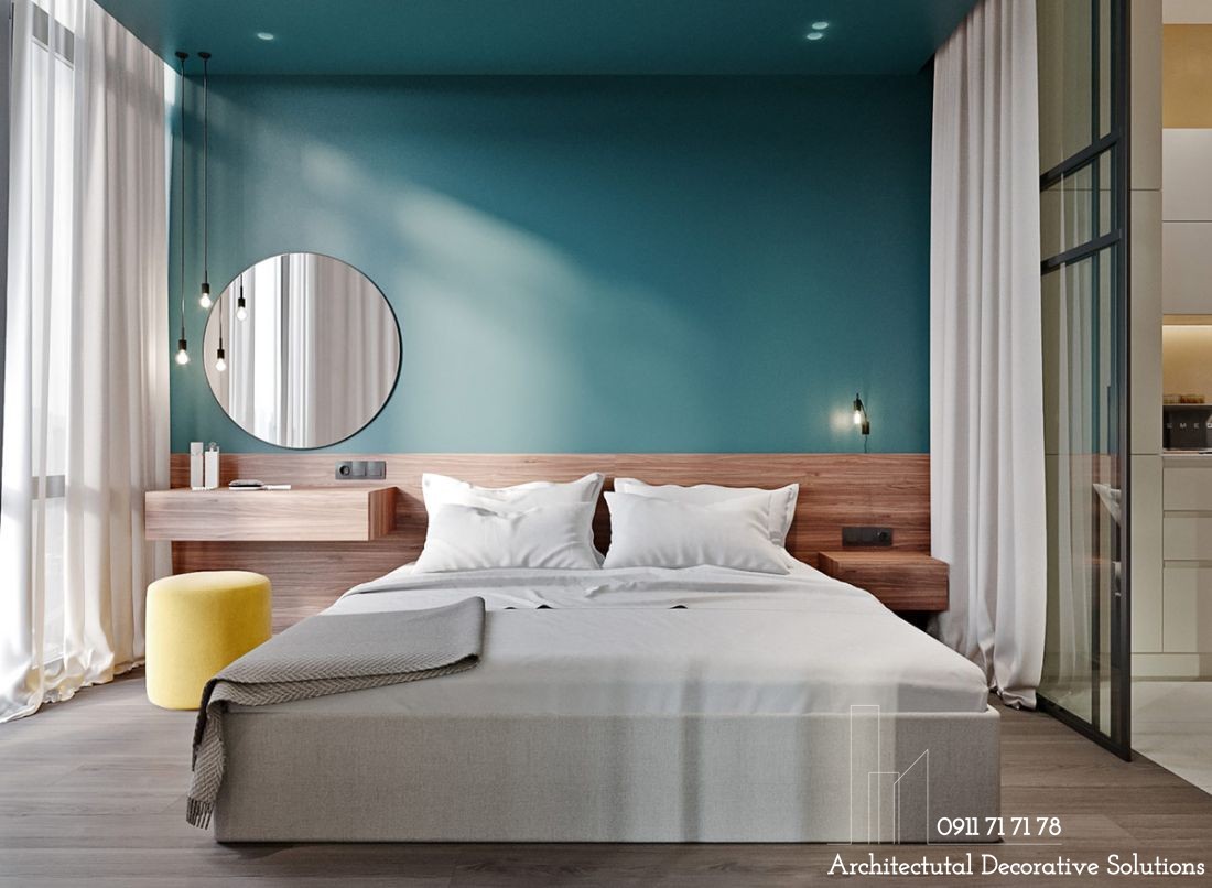 Một bức tường màu xanh phía đầu giường tạo cảm giác tươi mới, trẻ trung. Bên cạnh đó là sự phối hợp các mảng màu nhẹ nhàng góp phần nên một không gian ngủ đầy hấp dẫn, mát mẻ. Một chiếc bàn trang điểm đơn giản với chất liệu gỗ sẽ giúp cân bằng lại vẻ đẹp hiện đại của căn phòng.