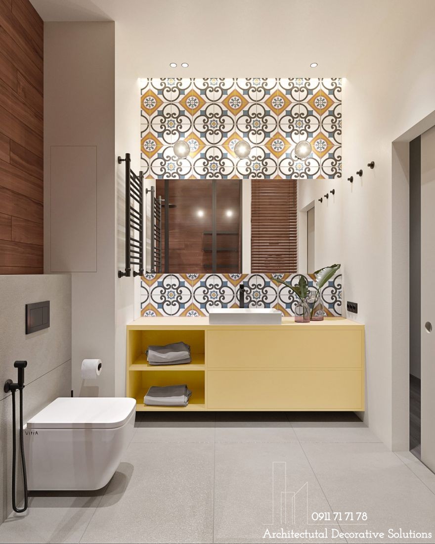 Các điểm nhấn màu vàng mang lại sự ấm áp, êm dịu cho phòng tắm thông qua bộ bàn trang điểm và gạch ốp tường có hoa văn tuyệt đẹp.
