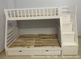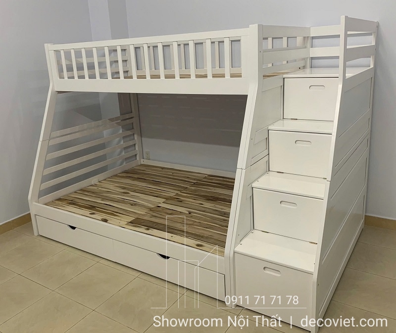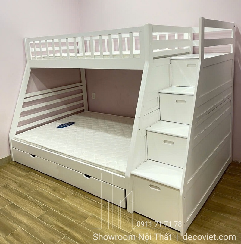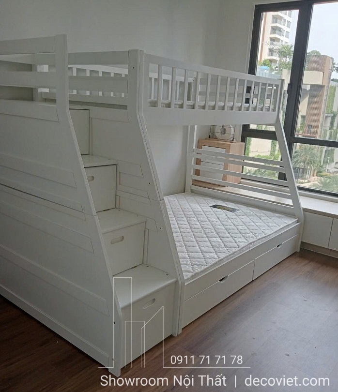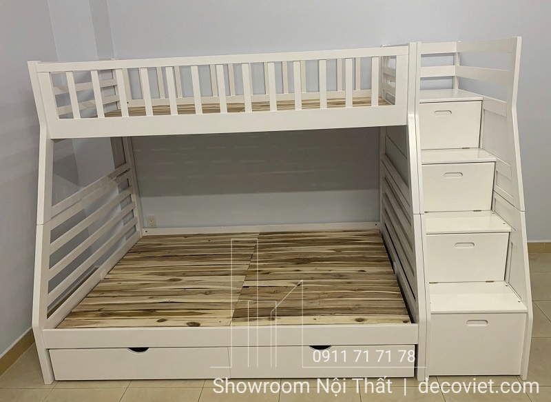 Thiết kế hiện đại của mẫu giường 2 tầng này còn rất tiện dụng, với cầu thang đặt trên giường giúp tiết kiệm diện tích và các bậc thang rộng rãi, thuận tiện cho trẻ em khi di chuyển lên xuống giường. Khoảng cách giữa các tầng khá cao, tạo sự thông thoáng, thoải mái mà không lo bị đụng đầu. Tầng trên và tầng dưới bằng nhau, mang đến vẻ ngoài gọn gàng và hài hòa cho không gian phòng ngủ.