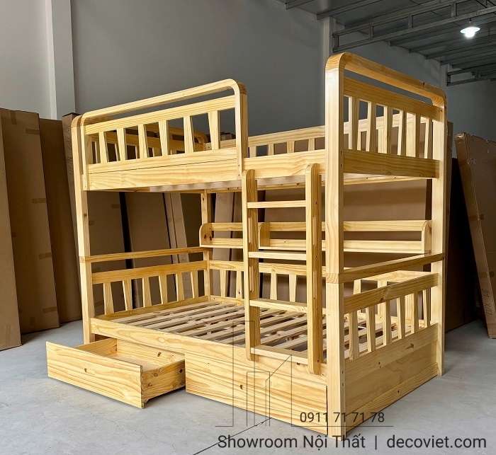 Mẫu giường tầng đẹp này được làm từ 100% gỗ thông cao cấp nhập khẩu từ NewZealand, đạt tiêu chuẩn xuất khẩu Châu Âu. Đặc biệt, gỗ được xử lý chống cong vênh, mối mọt kỹ lưỡng, đảm bảo an toàn tuyệt đối cho trẻ khi sử dụng. Với hai giường ngủ và 2 hộc ngăn kéo dưới tầng 1, sản phẩm không chỉ giúp tiết kiệm không gian mà còn rất tiện lợi cho việc cất giữ đồ dùng cá nhân.