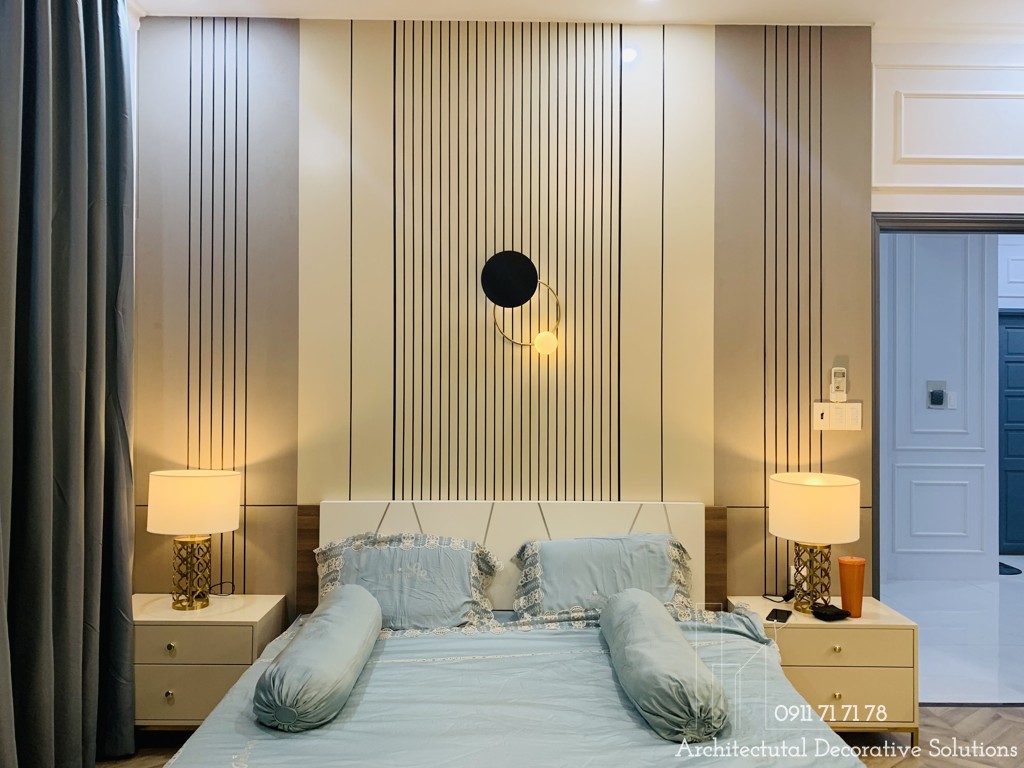 Phòng ngủ tại căn hộ mang một vẻ đẹp sang trọng, ấn tượng. Phòng ngủ được tạo ấn tượng bởi các tone màu đẹp nhẹ nhàng, tươi mới. Phòng ngủ mang đậm tính hiện đại, tinh tế nhưng không kém phần tiện nghi và ấm cúng.