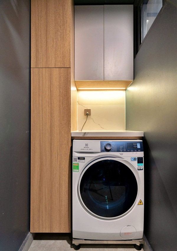 Bên cạnh khu vực phòng tắm là không gian giặt phơi được bố trí gọn gàng, thông minh. Máy giặt lồng ngang hiện đại được đặt vừa vặn trong hộc tủ tích hợp cùng hệ tủ lưu trữ phía trên, vừa tiết kiệm diện tích vừa đảm bảo tính thẩm mỹ. Ánh sáng đèn hắt giúp không gian này luôn sáng sủa và dễ sử dụng, góp phần hoàn thiện công năng cho căn hộ 3 phòng ngủ sang trọng tại LUMIÈRE RIVERSIDE.