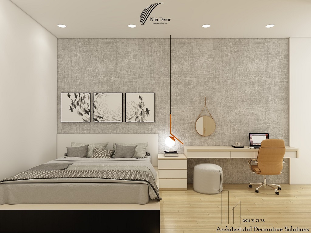 Phòng ngủ rộng rãi, tone màu xám tiếp tục nắm vai trò chủ đạo trong thiết kế nội thất phòng ngủ của căn hộ. Nội thất phòng ngủ cao cấp làm tăng thêm vẻ đẹp hiện đại cho phòng ngủ.