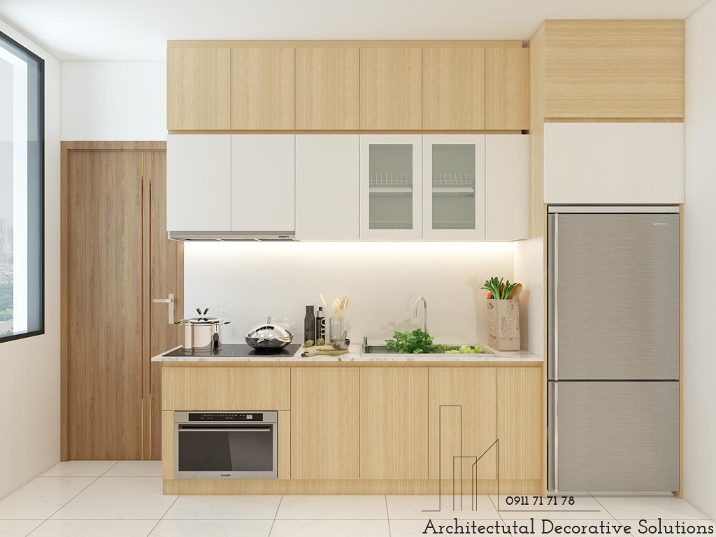 Bếp được bố trí dọc theo tường nhà, ngay lối vào