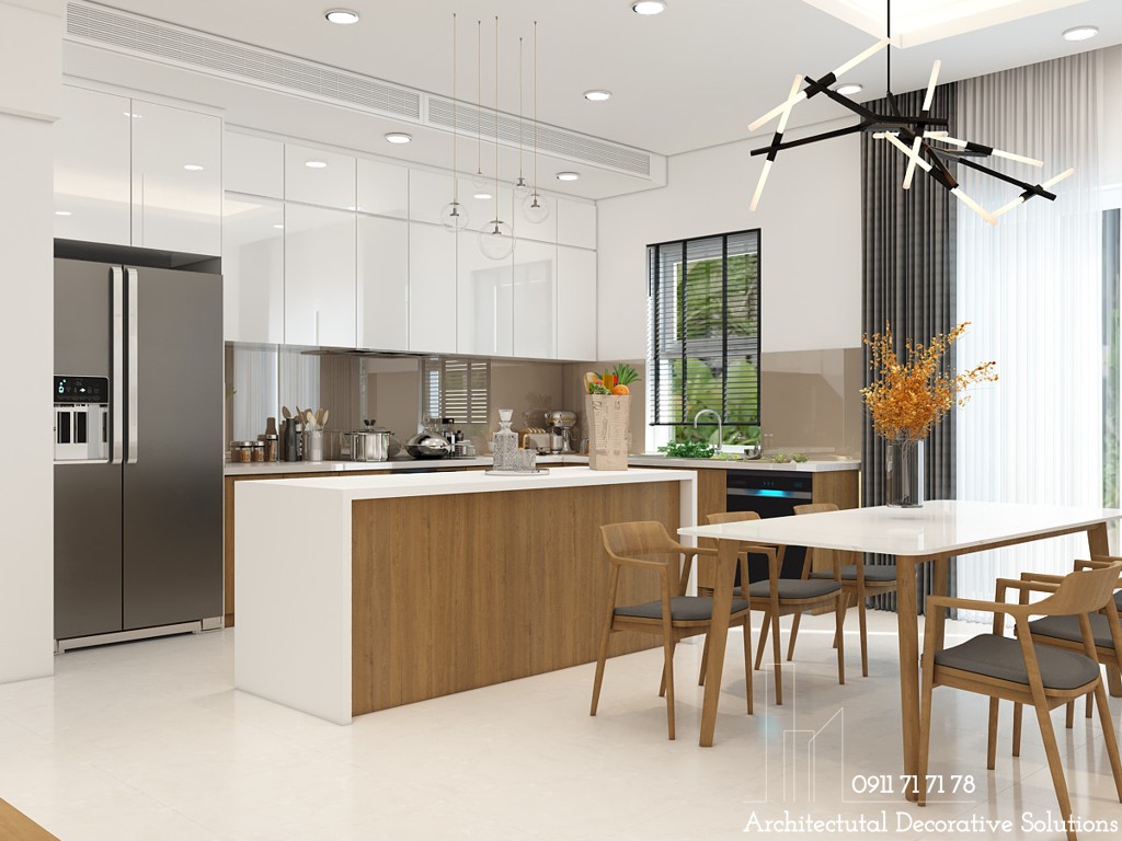 Khu vực phòng bếp với nội thất cực kỳ đơn giản nhưng không kém phần sang trọng hiện đại, với tông màu trắng đem lại cho không gian bếp thêm phần rộng rãi, thoáng mát.