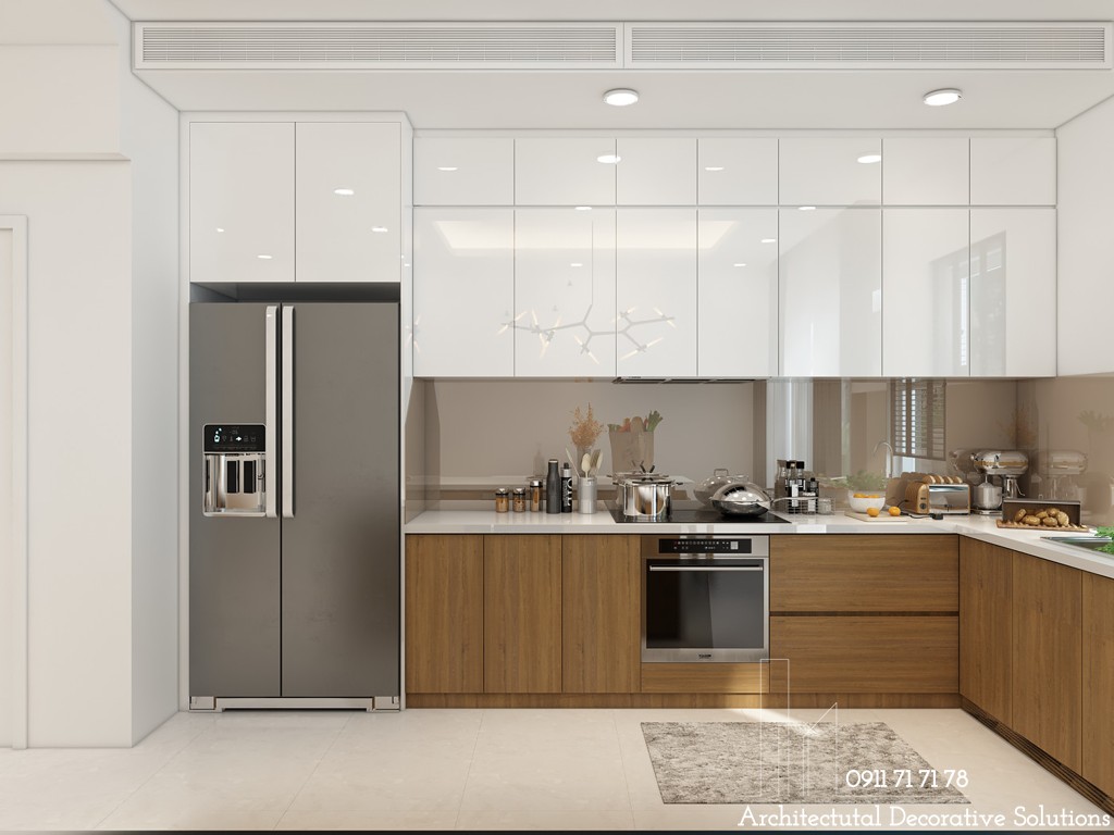 Phòng khách và phòng bếp được bố trí liên kết với nhau để mọi thành viên trong gia đình có thể dễ dàng kết nối, và tiện cho việc sinh hoạt. Phòng bếp của căn hộ được thiết kế vô cùng tối giản. Điểm đặc biệt là phòng bếp được thiết kế sử dụng tủ bếp đụng trần tiết kiệm được một khoảng không gian.
