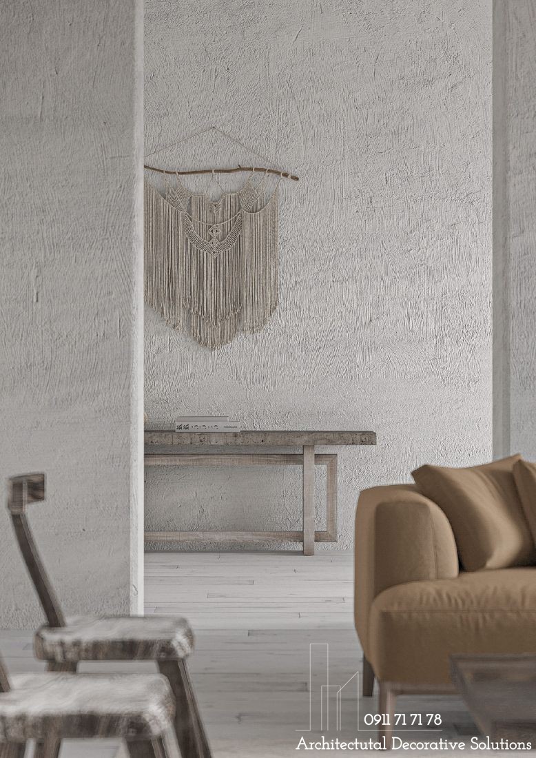 Sofa màu nâu cùng bàn gỗ hình chữ nhật là những chi tiết ấn tượng, là điểm nhấn trong không gian với các bức tường được trát vữa này. Chuộng những điều nguyên sơ như những gì vốn có của nó, phong cách Rustic chủ yếu sử dụng các màu sắc nguyên bản không pha tạp, không biến thể vào thiết kế nội thất. Các màu nguyên bản, không hòa trộn luôn đem lại hiệu ứng mạnh cho thị giác. Những màu sắc này cũng đem lại cho con người cảm nhận được sự chân chất là chính mình, không bon chen, sống một cuộc sống bình dị.