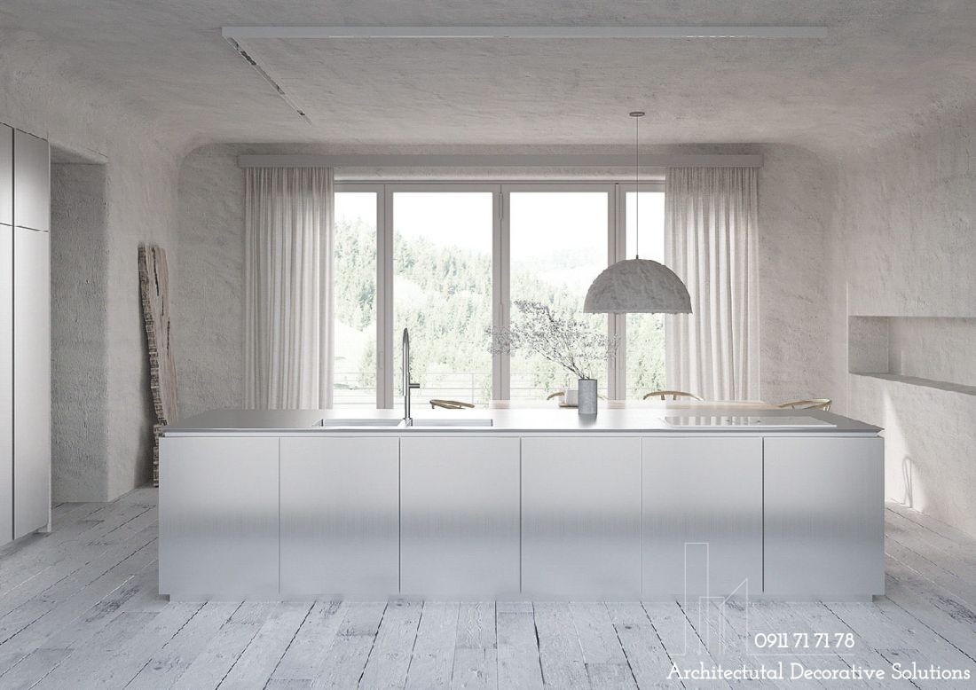 Bàn ăn được thiết kế chạy song song với đảo bếp hình chữ nhật màu xám, mở ra các cửa sổ lớn phía sau với một khoảng trời mênh mông có view tuyệt đẹp.
