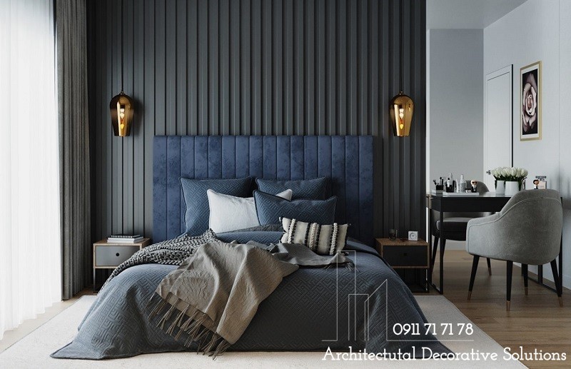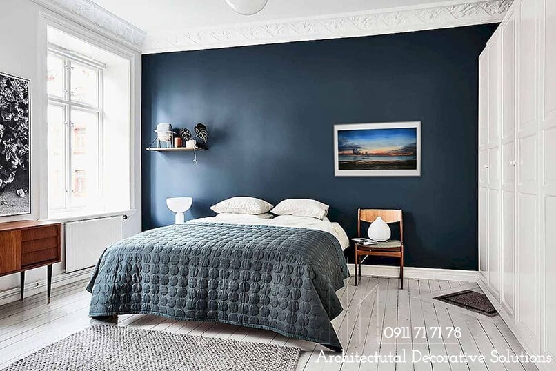Phòng ngủ xanh đậm kết hợp với nội thất sang trọng. Màu xanh đậm mạnh mẽ kèm theo giường ngủ sang trọng sẽ là yếu tố ưa thích của nhiều cặp đôi hoặc gia đình trẻ. Nó gây ấn tượng thị giác mạnh mẽ cùng sự đa dạng về nội thất khiến khu vực sinh hoạt dễ dàng hơn.