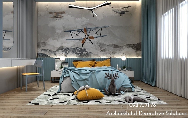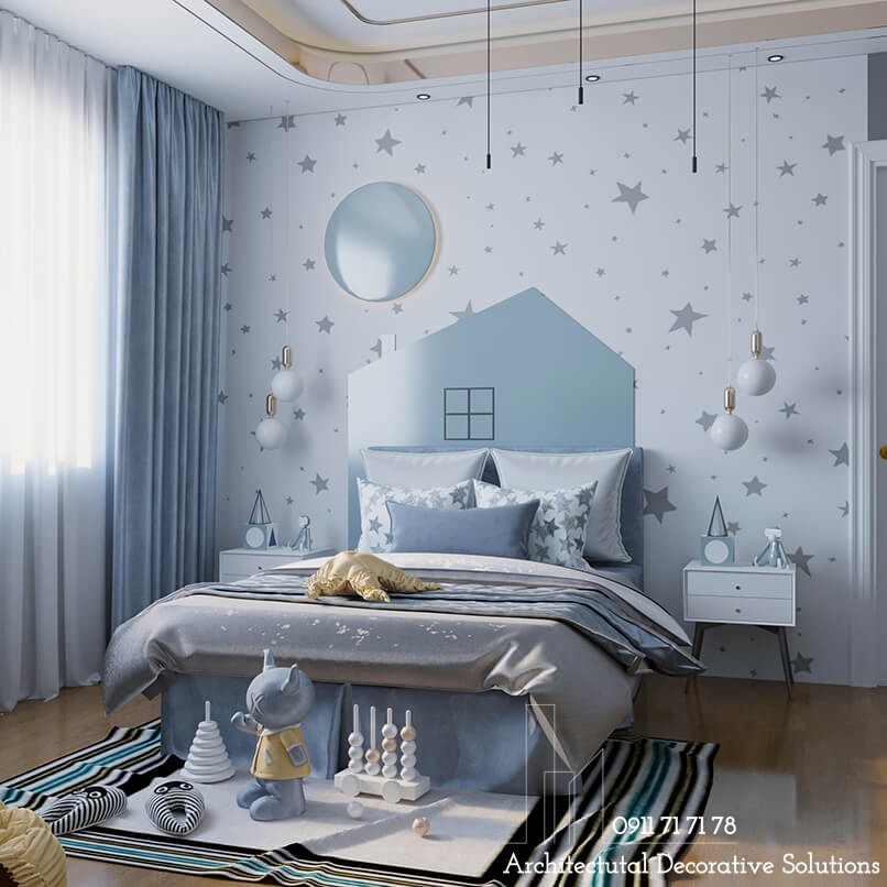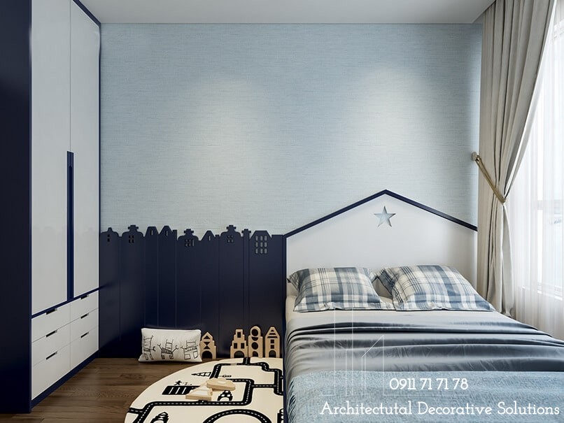 Phòng ngủ màu xanh nhẹ nhàng cho trẻ em. Hãy đem màu xanh này vào không gian của con bạn, nó sẽ đem lại không gian lớn hơn cho trẻ em vui chơi. Ngoài ra phong cách nhẹ nhàng giúp bé thoải mái, phấn chấn mỗi khi thức dậy.